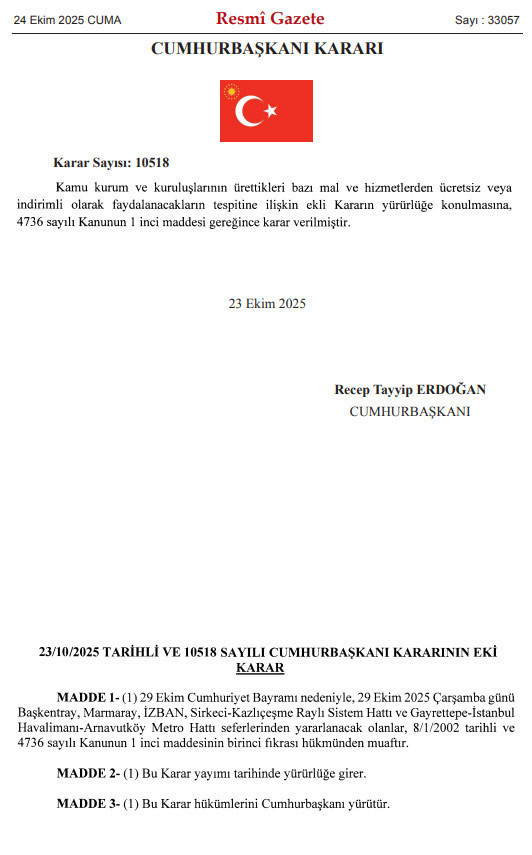 Cumhurbaşkanı Recep Tayyip Erdoğan’ın imzasıyla yayımlanan karara göre, 29 Ekim Cumhuriyet Bayramı sebebiyle 29 Ekim Çarşamba günü Başkentray, Marmaray, İZBAN, Sirkeci-Kazlıçeşme Raylı Sistem Hattı ve Gayrettepe-İstanbul Havalimanı-Arnavutköy Metro Hattı seferleri ücretsiz olacak.