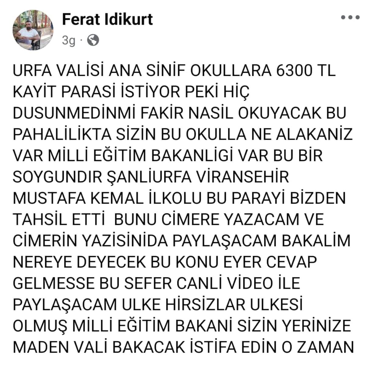 Şanlıurfa’da da bir yurttaş sosyal medya hesabından kentin Valisine çağrıda bulunarak, anaokulunun kayıt için 6 bin 300 lira istediğini ifade etti.