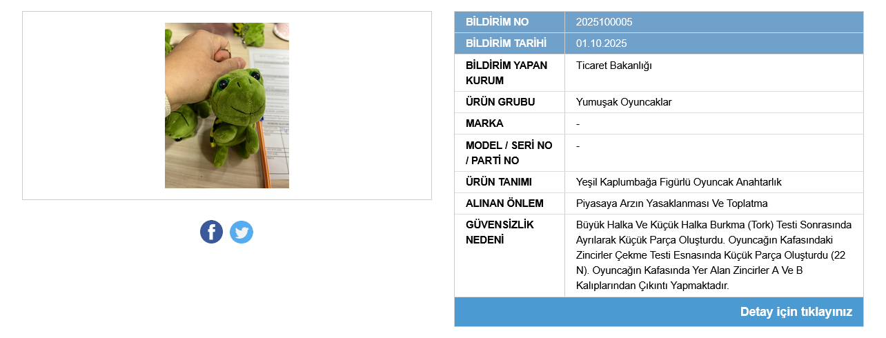 “Yumuşak oyuncaklar” kategorisinde güvensiz bulunan bir diğer ürün ise “Yeşil Kaplumbağa Figürlü Anahtarlık” idi. Bu ürün de güvensiz bulundu.